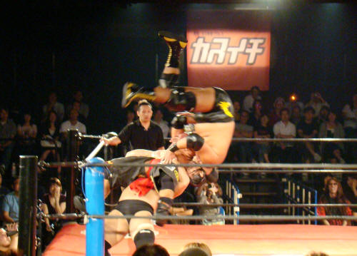 コーナー上段、大鷲に雪崩式仕掛けたYASSHIごと放り投げる関本…すごっ。
