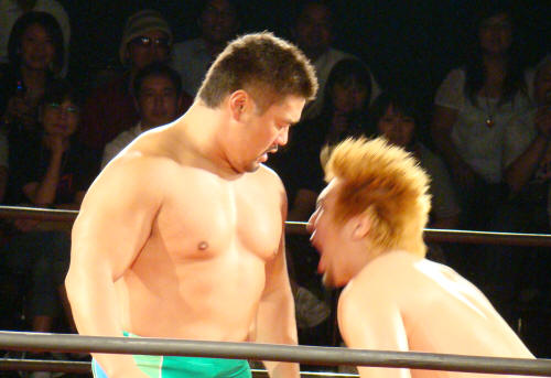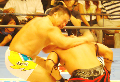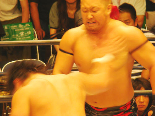 菅原には凄くやさしめのチョップでした。高山にもまだトップギアで入れてなかったし…。