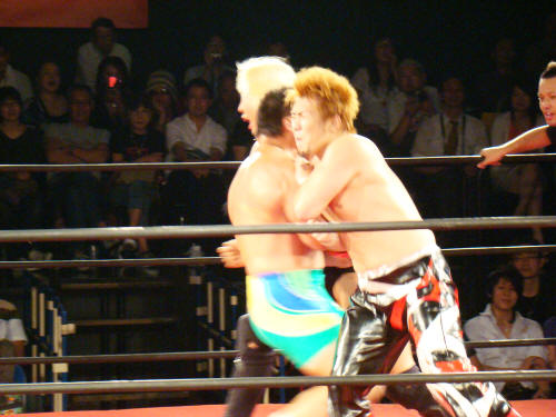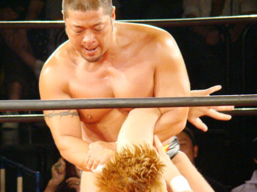 ロープで勢いつけてのぶちかましを何往復か。健介ビクともせず。