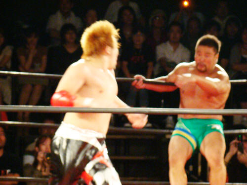 ヘロヘロになったところに健介がガッとぶつかり吹っ飛ぶ。