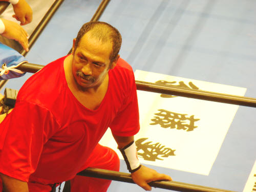 健介を制してディックさんが出ようとすると、青コーナーの菅原が健介ご指名。