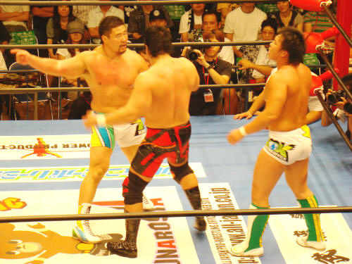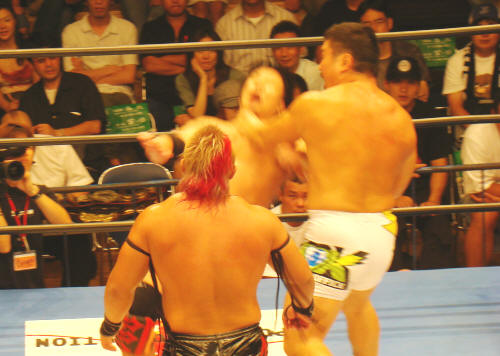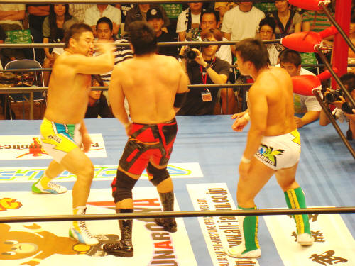 小島を逆水平とキックの挟み撃ち。健介が勝彦に「行けっ!」