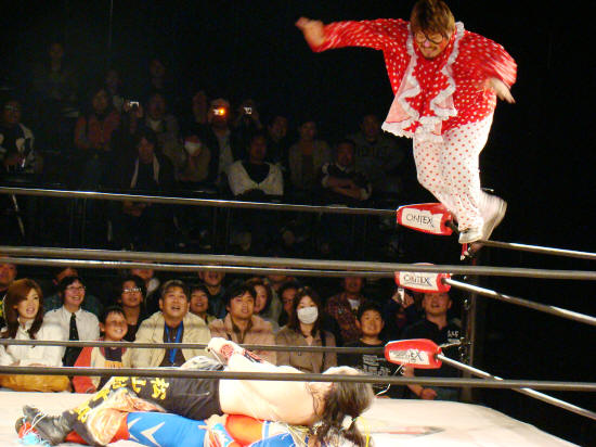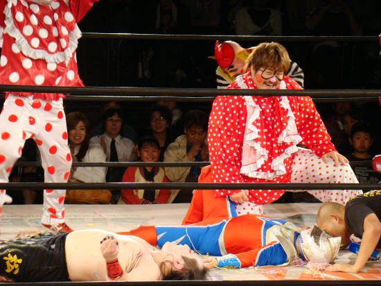 最後はミラクルマンと勘十郎をふたつ重ねて吉江がドーンとボディプレス。