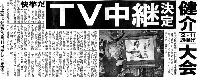 さてさて、気が付けば日曜に迫った健介オフィス旗揚げ興行。テレビ東京で中継も決まり(テレ朝だったらもっと良かったのにね)前売りも完売寸前と、話題を振り撒きながら当日に突入しそうな勢いです(画像は先日の東スポ記事)