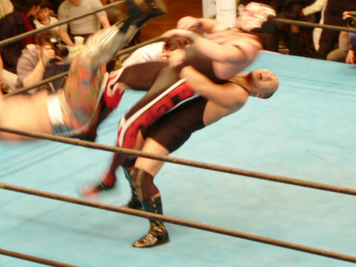 竹村がミサイルキック→正田が投げっぱなし。
