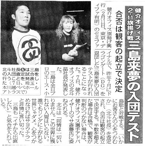 健介オフィス・北斗晶代表取締役が全日本・本川越大会で会見を開き、2.11ディファ有明で行われる『健介オフィス旗揚げ興行~Take The Deam夢を掴め!~』の対戦カードを発表。入団を希望する元ドラゴンゲートの三島来夢が小島聡を相手に「入団テストマッチ」を行うことが決まった。