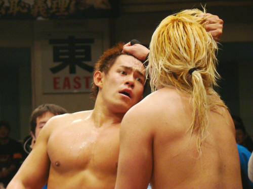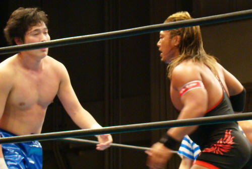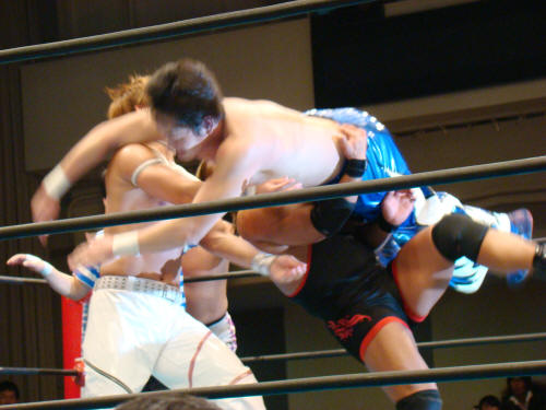 終盤にTAKAが火野の対角線ラリアットをモロに受けたり、