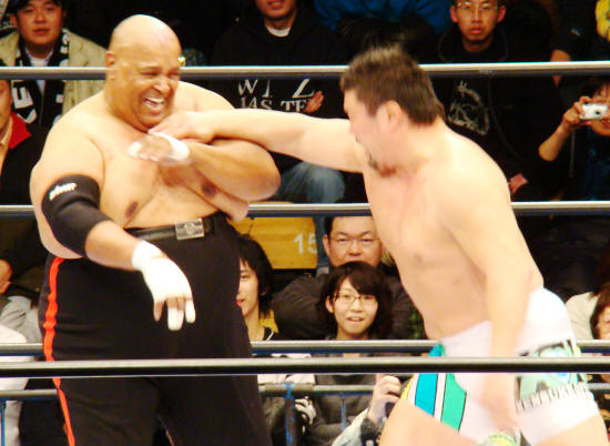睨みあう健介とみのる。みのるをズイッと脇にどかしブッチャー対健介。