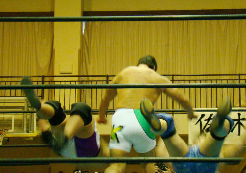 健介がお返しのラリアット。一発…KAZMA持ちこたえる。会心の二発めで終了。