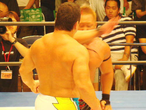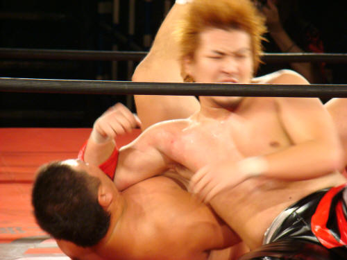 菅原には凄くやさしめのチョップでした。高山にもまだトップギアで入れてなかったし…。