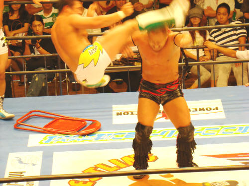 小島を逆水平とキックの挟み撃ち。健介が勝彦に「行けっ!」