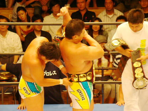 お馴染みのテーマにのって赤コーナーからベルト姿の健介&勝彦登場。