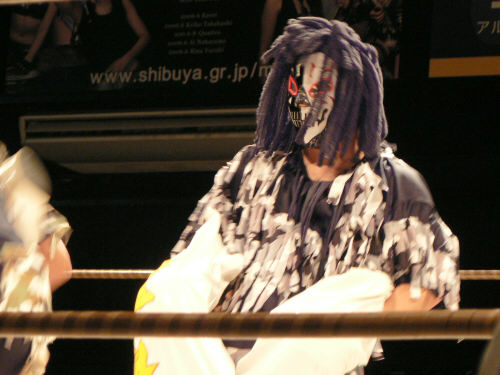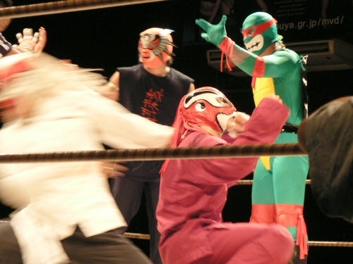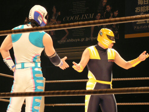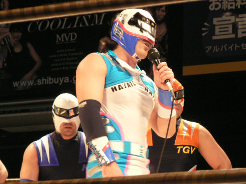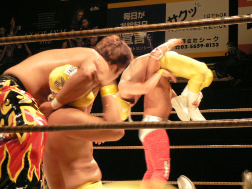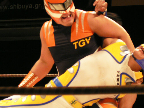 リングが埋まるほどの紙テープ(ワタシ投げたの含む)片付ける間もなく、コール終了と同時にTGV側の奇襲から始まり、めまぐるしい攻防。チカラで勝るルードにチームワークで対抗するテクニコ。最後はテクニコが勝って、お客さんみんなニコニコ大満足♪